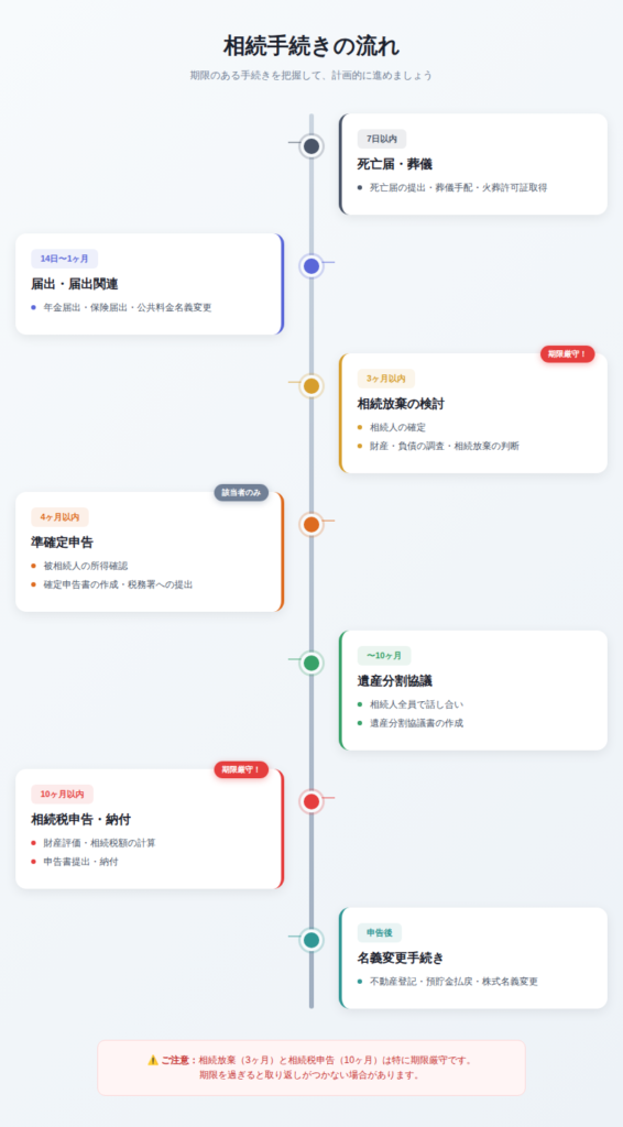 相続が発生すると、やるべきことが一気に押し寄せてきます。まずは「どんな手続きがあるのか」を把握することが大切です。